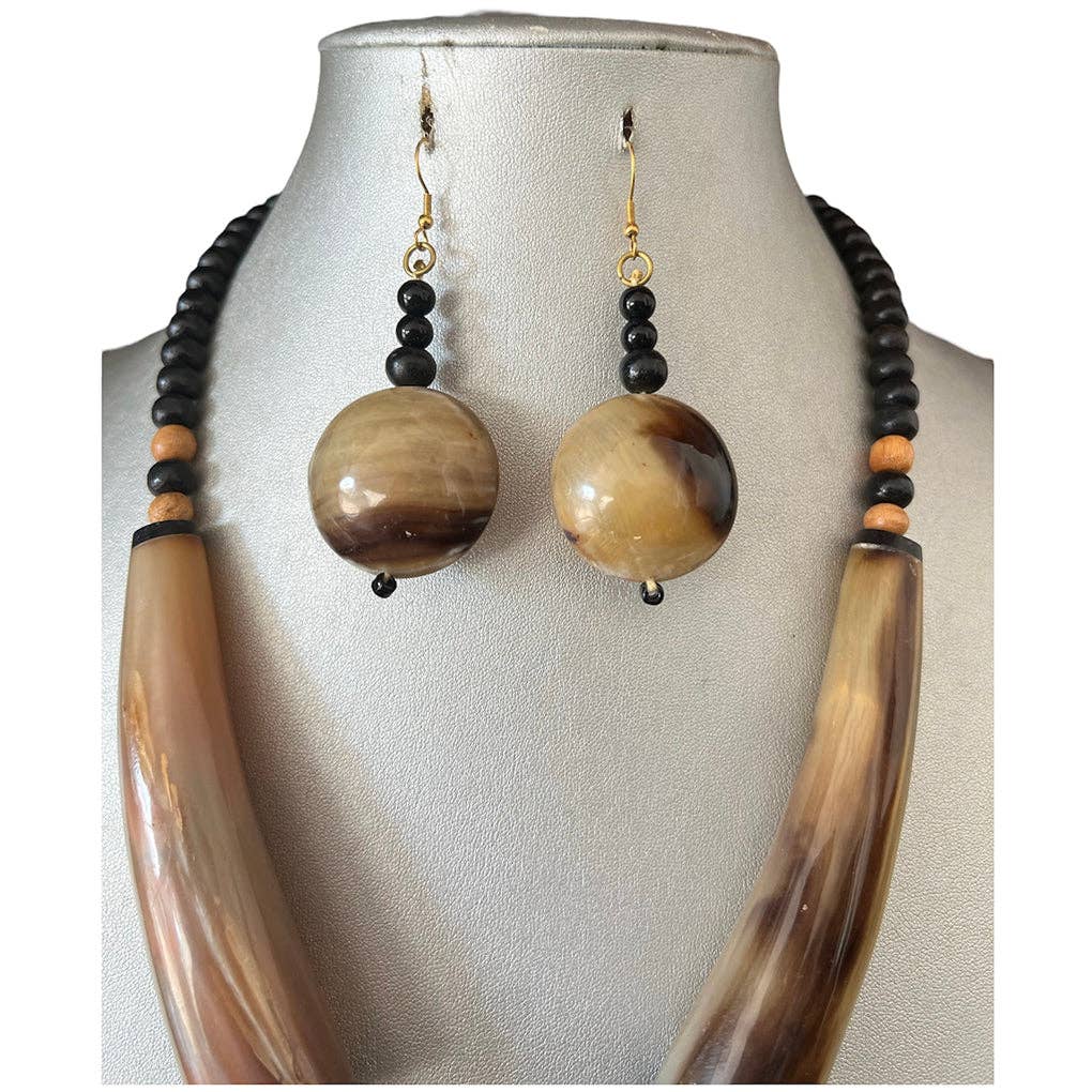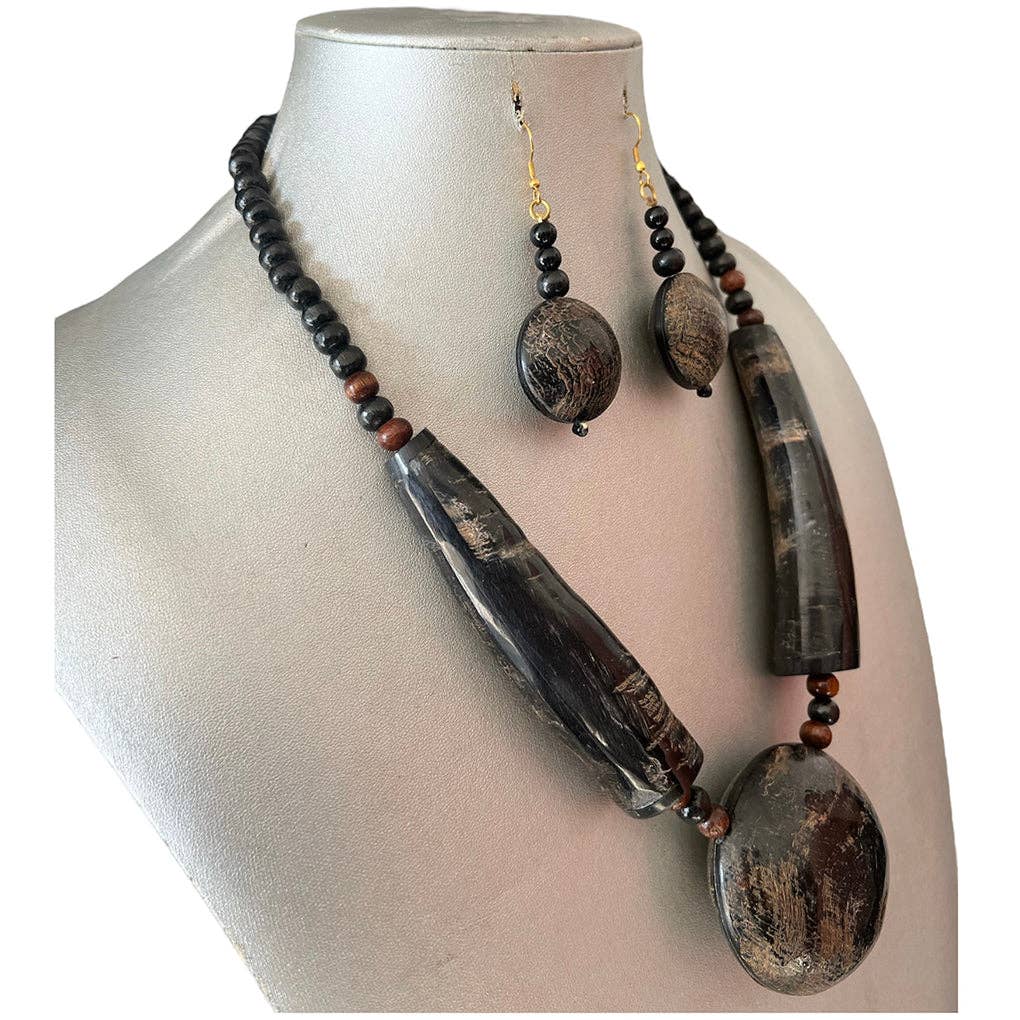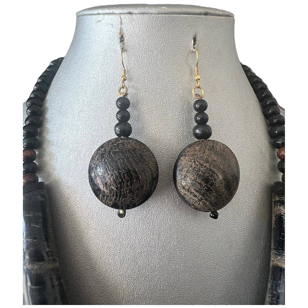 The African Tribal Wooden Necklace and Earrings Set is a testament to the captivating fusion of nature and culture. Crafted with precision and adorned with authenticity, this exquisite jewelry set celebrates the rich and diverse traditions of Africa. The necklace and earrings are meticulously handcrafted from locally sourced wooden materials, reflecting the deep-rooted connection between the continent and its abundant natural resources. Each wooden bead and pendant is meticulously carved and often embellished with intricate tribal motifs, representing the artistic heritage of African communities. This set exudes a distinctive charm, capturing the earthy and raw essence of Africa's tribal aesthetics. It's a unique and beautifully bold expression of African culture, making it a treasured addition to any jewelry collection while honoring the continent's artistic and traditional legacy. Measurements: Length: 13.5 inches Earrings: 3 inches