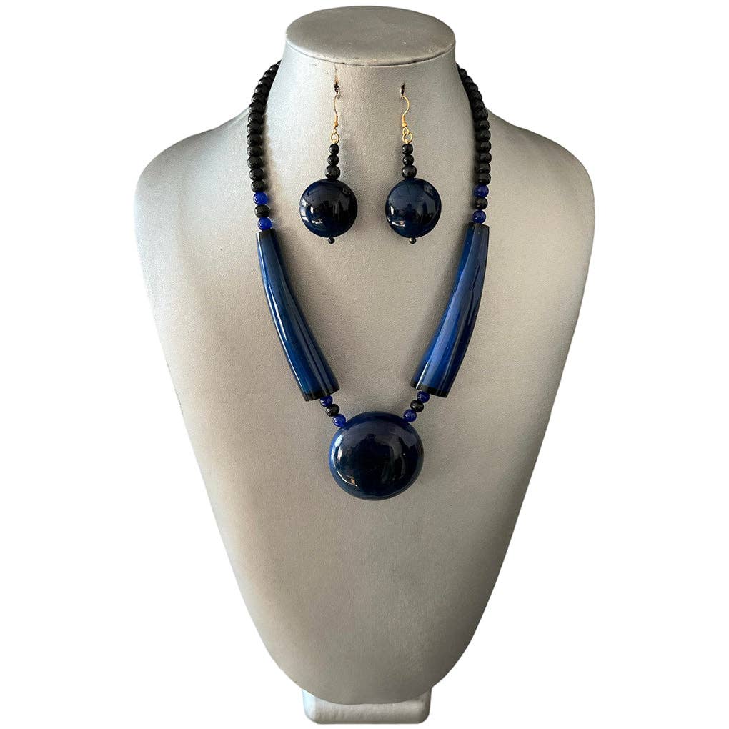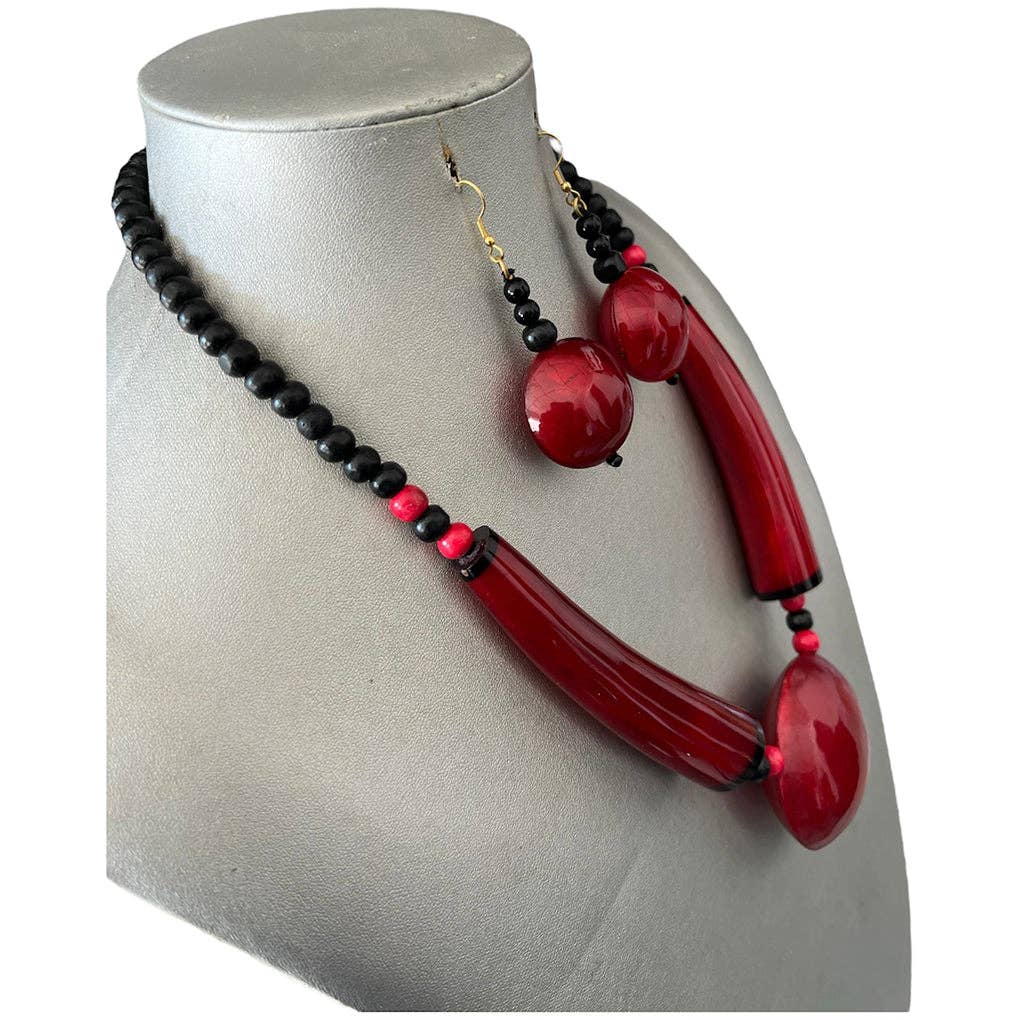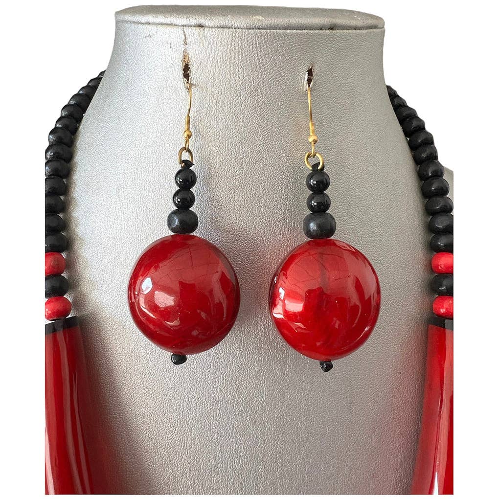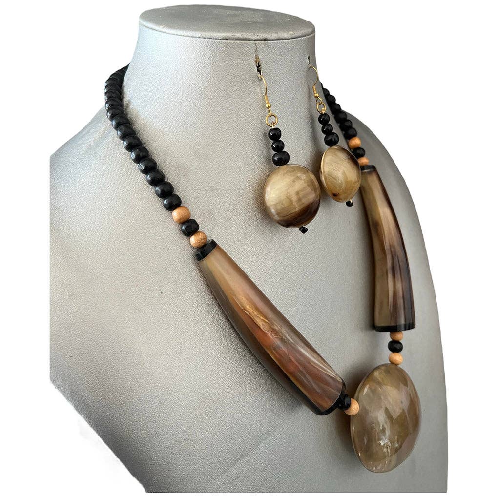 The African Tribal Wooden Necklace and Earrings Set is a testament to the captivating fusion of nature and culture. Crafted with precision and adorned with authenticity, this exquisite jewelry set celebrates the rich and diverse traditions of Africa. The necklace and earrings are meticulously handcrafted from locally sourced wooden materials, reflecting the deep-rooted connection between the continent and its abundant natural resources. Each wooden bead and pendant is meticulously carved and often embellished with intricate tribal motifs, representing the artistic heritage of African communities. This set exudes a distinctive charm, capturing the earthy and raw essence of Africa's tribal aesthetics. It's a unique and beautifully bold expression of African culture, making it a treasured addition to any jewelry collection while honoring the continent's artistic and traditional legacy. Measurements: Length: 13.5 inches Earrings: 3 inches