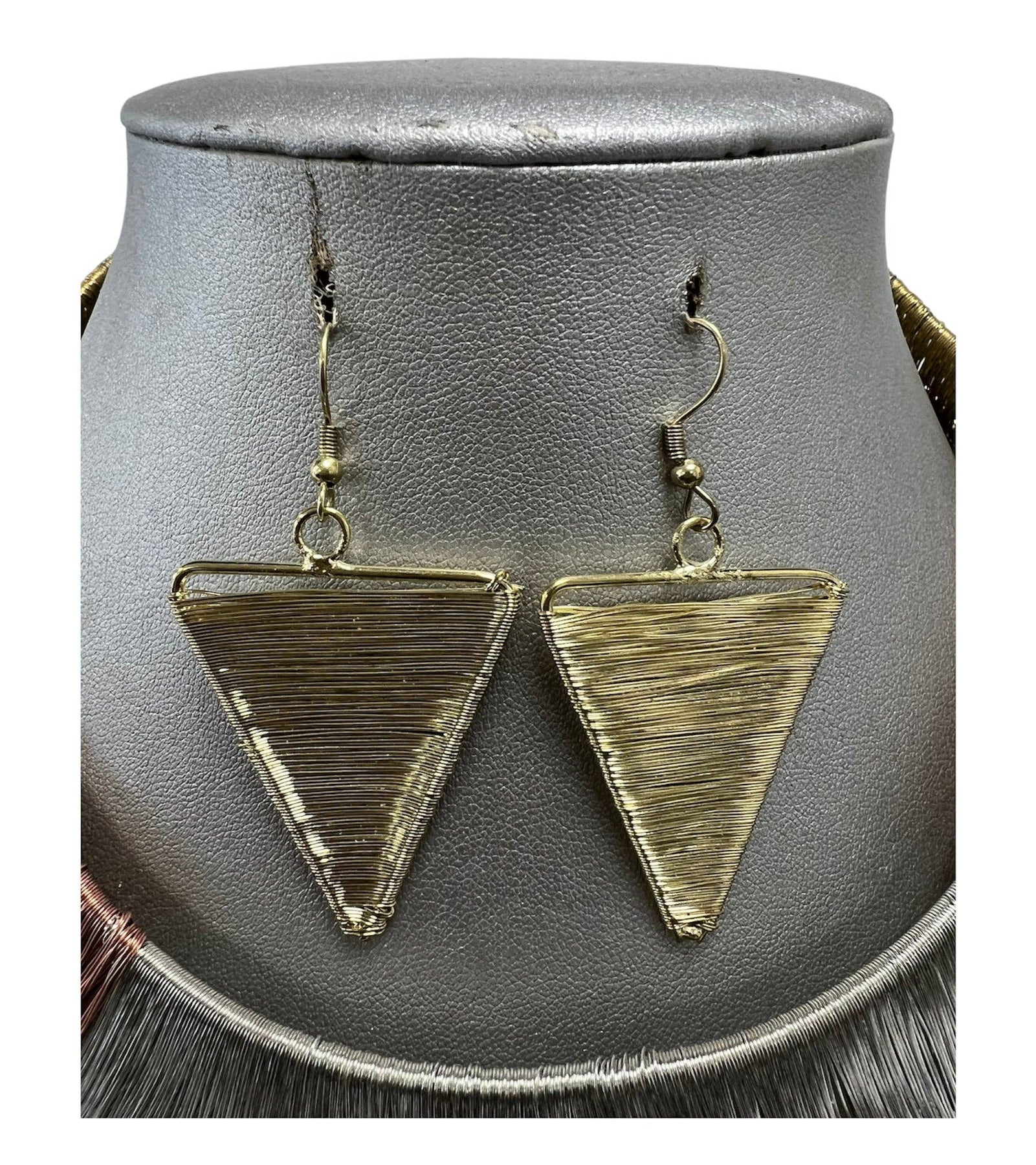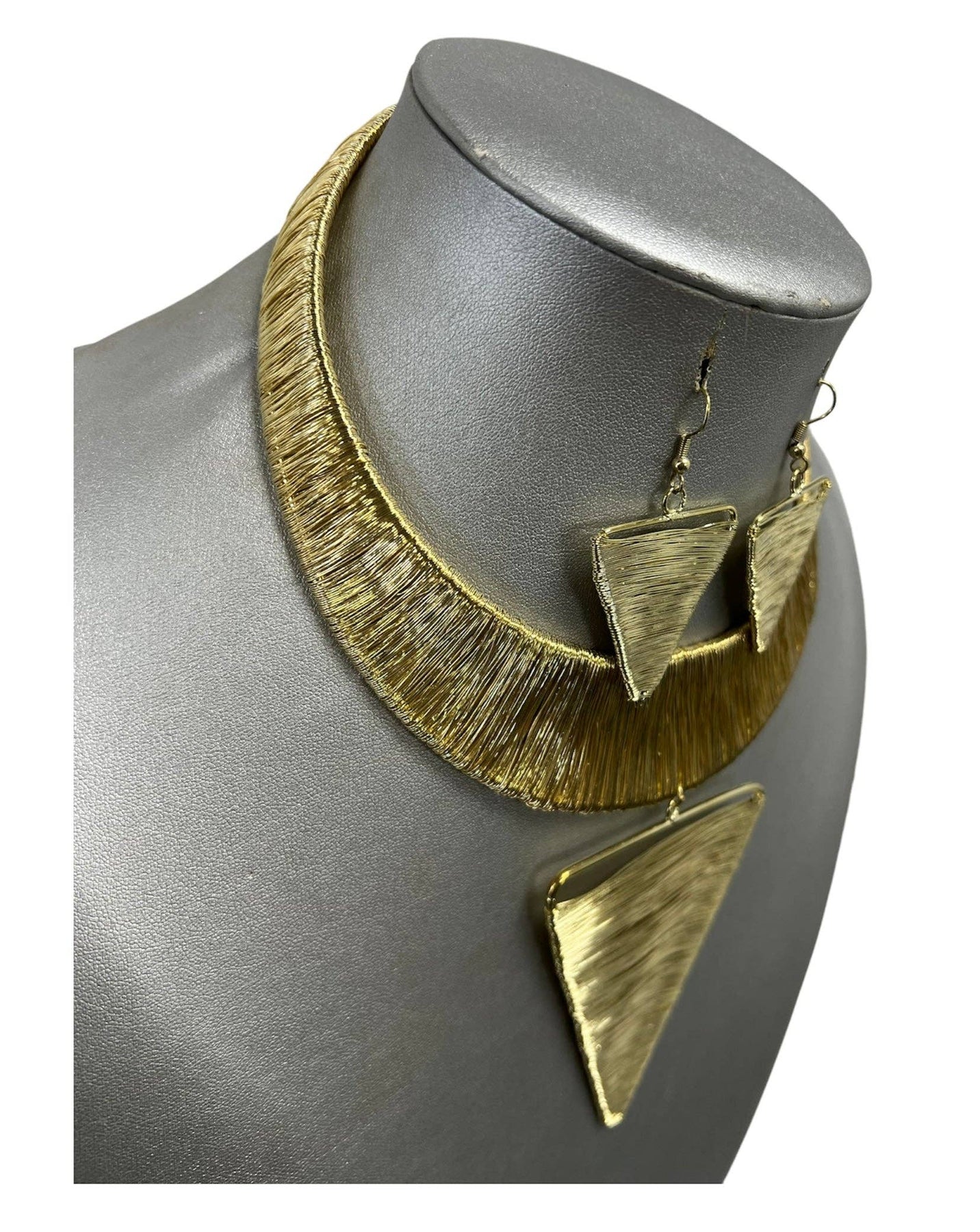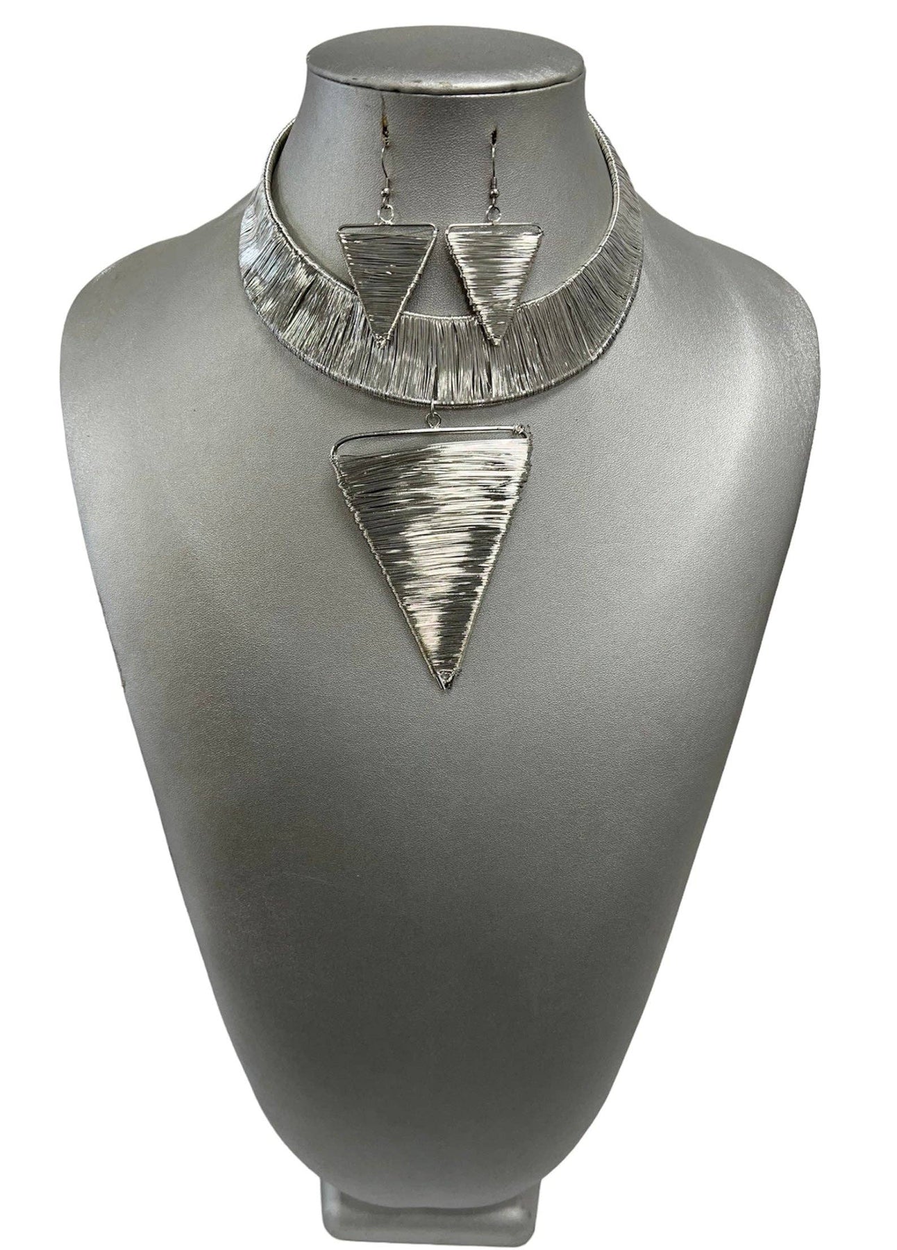 This necklace set features: * Choker style necklace with cuff neck * Triangular pendant in the middle with matching earrings * Available in tricolor, gold and silver Elevate your jewelry collection with our Women's Choker Necklace Set featuring a unique cuff back closure. This set is a perfect blend of contemporary fashion and edgy sophistication. The choker necklace adds a touch of modern style and elegance to your neckline, while the cuff back closure provides a secure and stylish way to fasten the piece. Crafted from high-quality materials, this set offers durability and versatility, making it suitable for a range of occasions, from casual outings to formal events. Whether you're dressing up for a special occasion or looking to add a fashion-forward accessory to your everyday look, this Choker Necklace Set with a cuff back is the ideal choice for women who appreciate bold, unique jewelry that makes a statement.